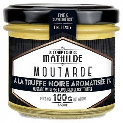 Moutarde à la truffe noire aromatisée 1% : MOUTARDE (graines de MOUTARDE, eau, vinaigre, sel, sucre, conservateur: SULFITE acide de sodium), brisures de truffes noires 1,12% (truffes noires (Tuber melanosporum), jus de truffes noires, eau, sel), arôme truffe.