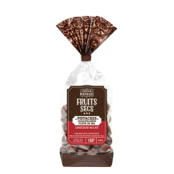 Ingrédients : Chocolat au LAIT 66% (sucre, beurre de cacao, poudre de LAIT entier, pâte de cacao, émulsifiant : lécithine de SOJA, arôme naturel de vanille. Cacao: 31% minimum), PISTACHE 21%, sucre, fleur de sel 0,5%, agents d’enrobage : gomme arabique, shellac; sucre, sirop de glucose.