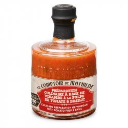 Ingrédients : Vinaigre d’alcool à 8% d’acidité 58%, coulis de tomates 38%, basilic 3%, sucre.