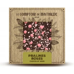 Dégustez notre tablette de chocolat noir à la praline rose de Lyon, avec son élégant contraste de couleurs et de saveurs, pour un moment chocolaté croquant de douceur.