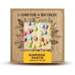 À tous les enfants, les grands enfants et les adultes raisonnables qui ont encore une âme d’enfant. Savourez notre délicieuse tablette de chocolat blanc agrémentée de dragées colorées qui sauront donner des couleurs à vos papilles !