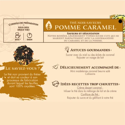 Thé noir aux notes boisées, légèrement typées sucre cuit, qui s’allie parfaitement avec la gourmandise du caramel et de la pomme